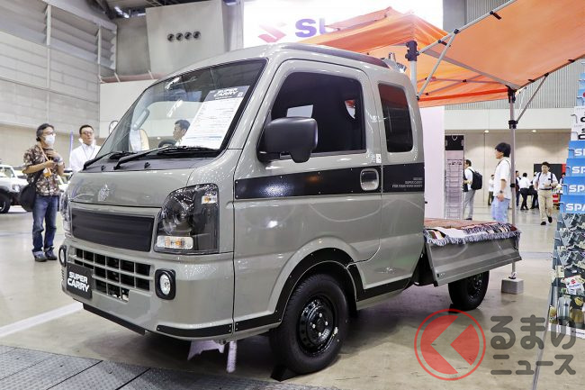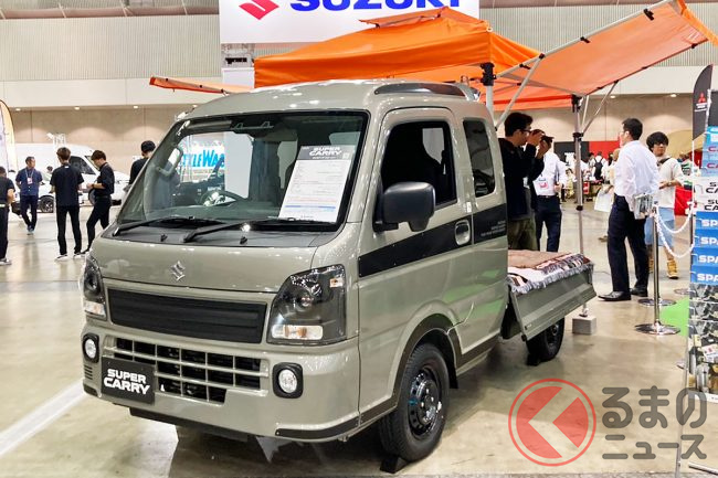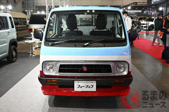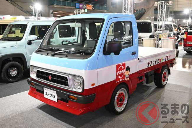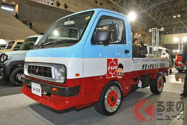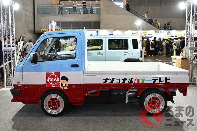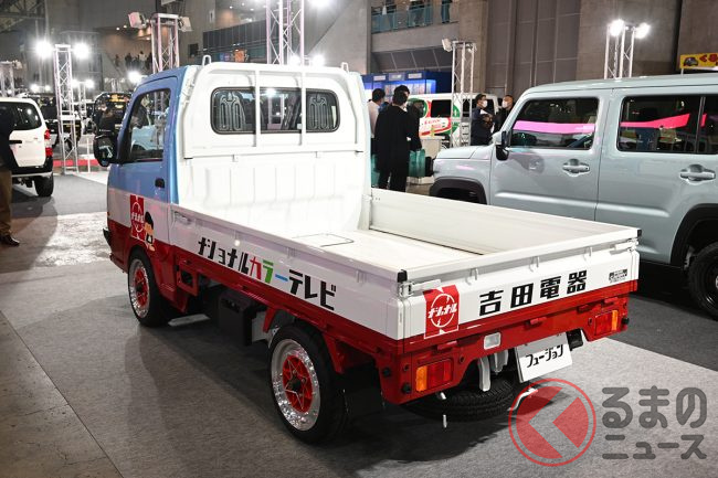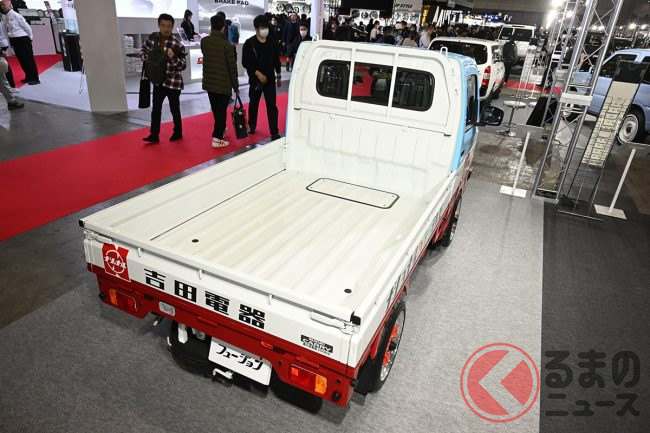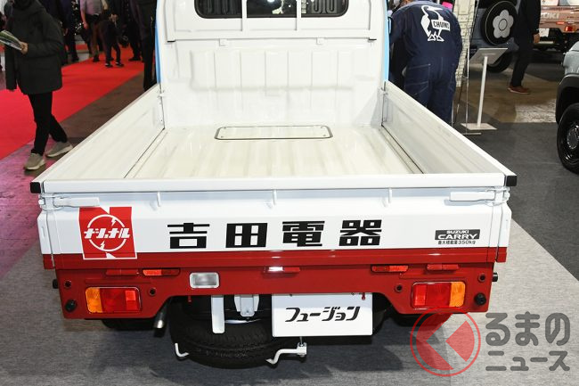 “サニトラ”顔の「軽トラ」公開! 旧車デザインが超カッコイイ「斬新モデル」はまさかの“スズキ製”! 昭和カラーもイイ“キャリイ”「吉田電器商用車」登場