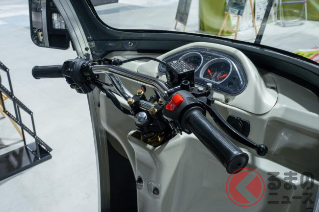 運転時はバー型ハンドルで操舵するためバイクのようにも見えますが、クルマと同じようにバックギアも搭載されており、入り組んだ狭い路地や駐車場での取り回しに苦労することはありません。