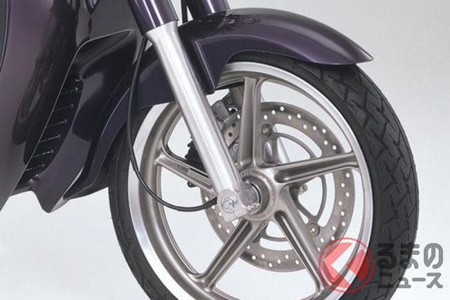 足回りには、フロントにブレーキディスク、リアにドラムブレーキを搭載。さらに、5スポークの大径アルミホイールにバイアスタイヤを装着し、走行安定性も確保されています。