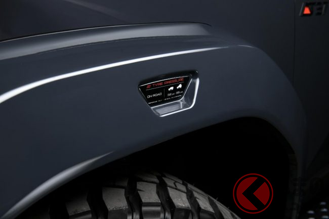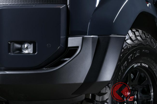 そんなアークティックトラックの最新作が今回発表されたAT37です。37インチタイヤからその名を取ったAT37の大きな特徴は足回りにあります。オーバーフェンダー、400mmのリフトアップ、マッドタイヤ、鍛造ブラックホイール、マッドガード、サイドステップなど、見るからにオフロード性能の高さが伺えます。