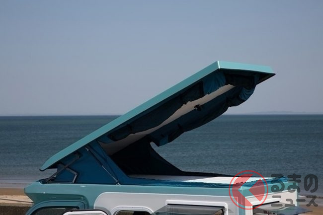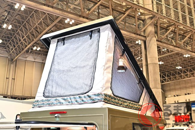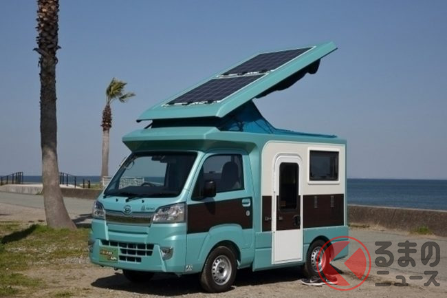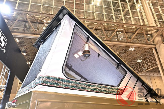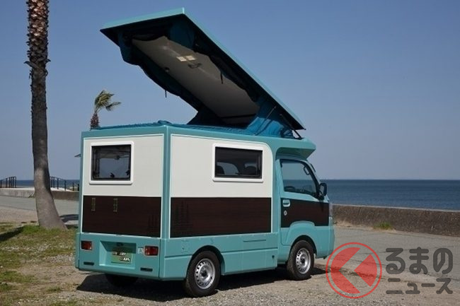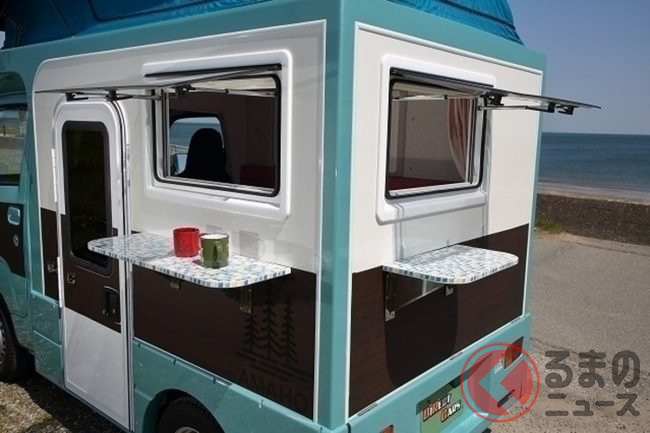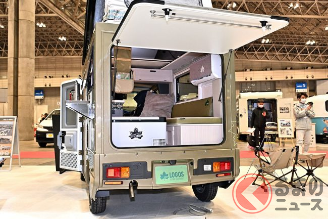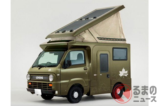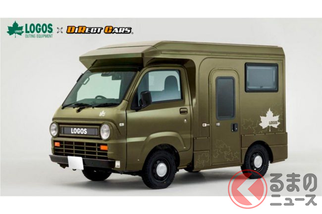 旧車デザインの新「4人乗り“軽トラ”」公開! 「“パカッ”とルーフ」で“車上泊”もできる! アウトドアブランドとコラボしたダイレクトカーズの軽キャンパー「アマホ ロゴス エディション」登場
