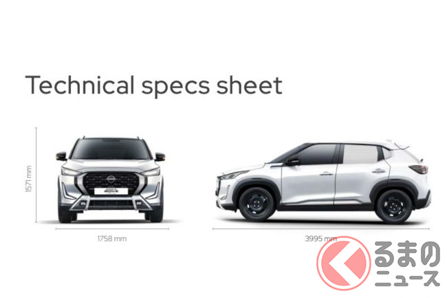マグナイトは2020年からインドで生産されている新興国向けコンパクトSUVです。ボディサイズは全長3995mm×全幅1758mm×全高1571mm、ホイールベース2500mm、最低地上高205mm。