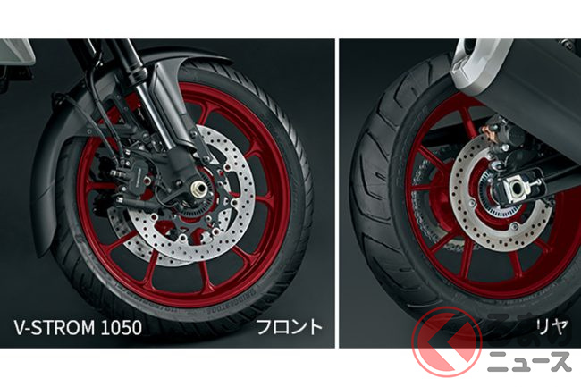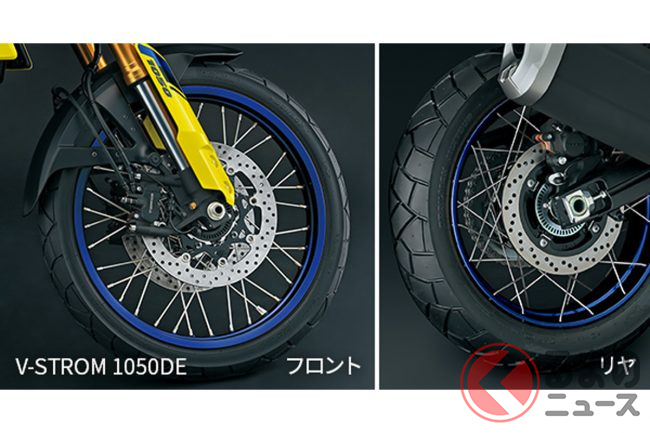 足回りは、モデルによって特徴が異なります。Vストローム1050は、フロントに19インチ、リアに17インチのキャストアルミホイールを装備し、オンロードでの安定した走行を提供します。一方DEモデルは、前後サスペンションのストローク量を伸長し、ホイールトラベル量を拡大。フロントに21インチ、リアに17インチのスポークホイールを採用し、グラベルと路での走破性を高めています。