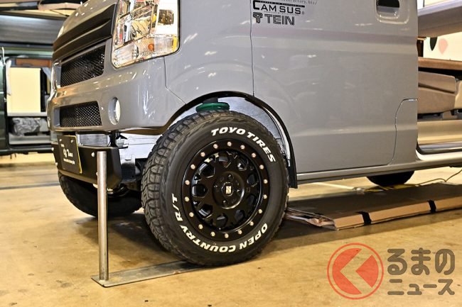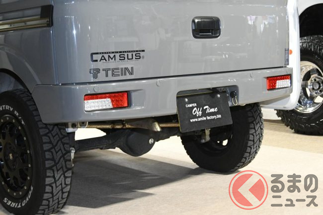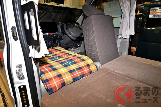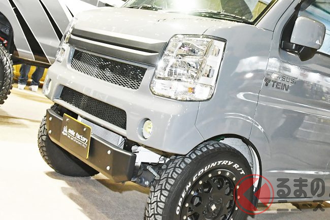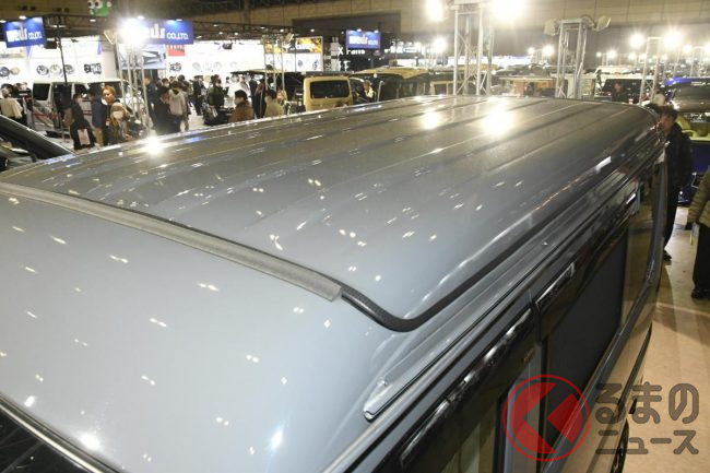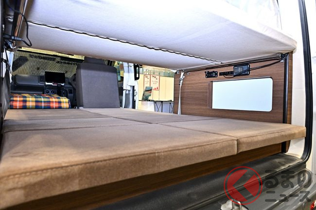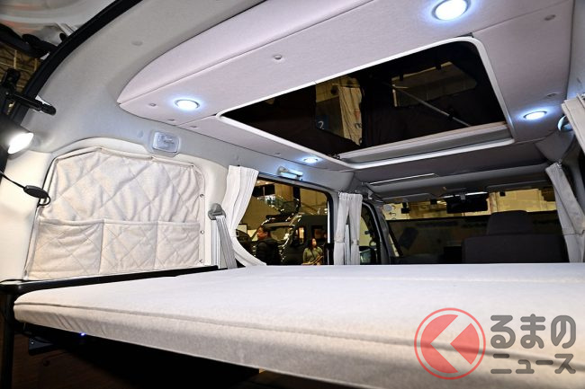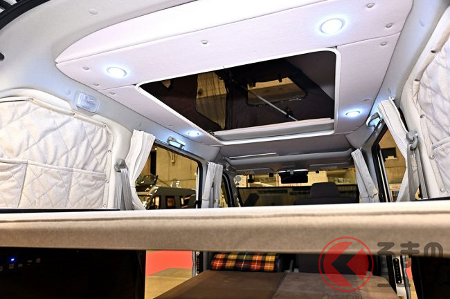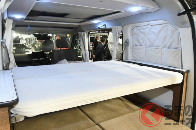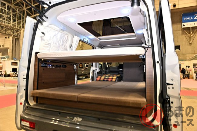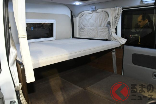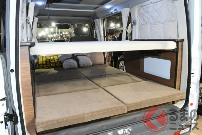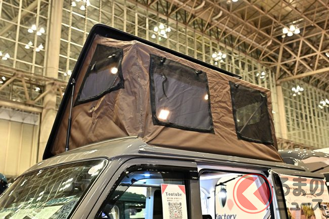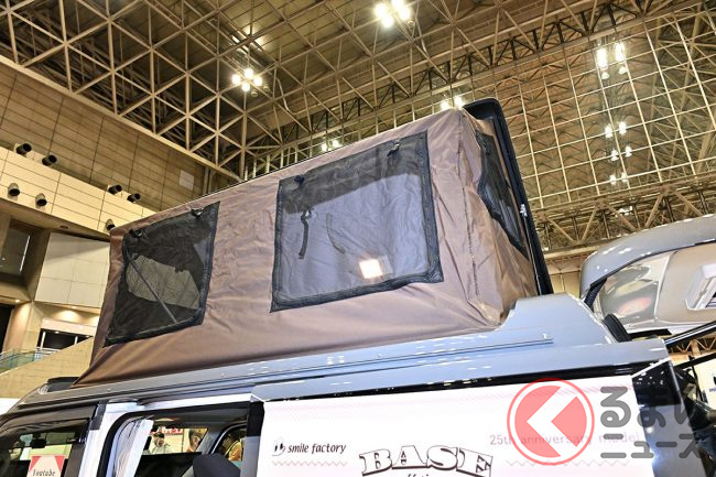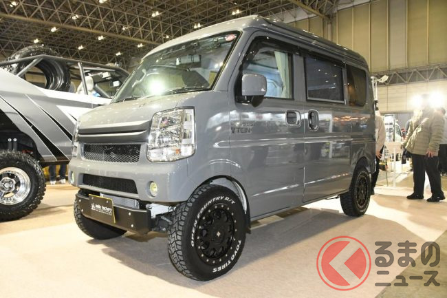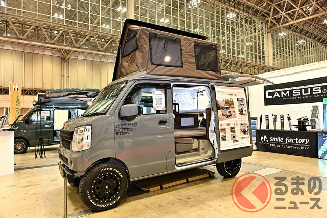 スズキ「車中泊“専用”軽バン」公開! 地上高アップ×斬新「横開きルーフ」が超カッコいい! 大人「4人」寝られる「エブリイ」カスタム「スマイルファクトリー オフタイムBASE」JCCSに登場