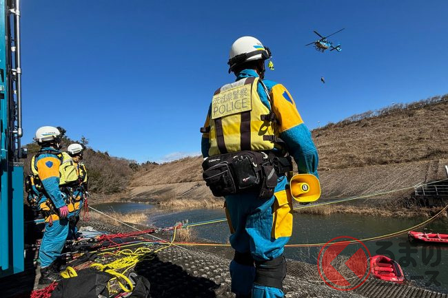 「アルファード」変形で解体、「セレナ」が土石流に埋没!? 茨城・埼玉の警察消防が総勢70名で救助…なにがあった? ヘリコプターも登場した大規模訓練とは