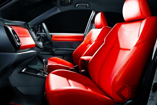 フロントシートに用いられた真っ赤なスポーツシートは、トヨタのデザイン部で保管されてきた初代カローラのカラーサンプルをもとに、往年の「赤」を忠実に再現。