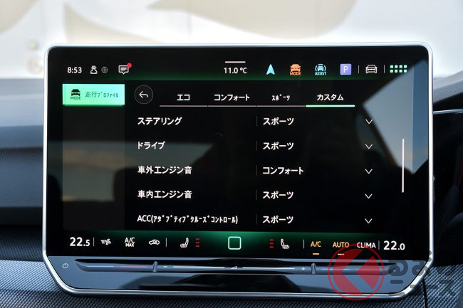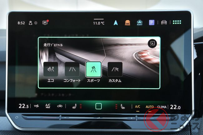 インテリアのアップデートはベースモデル同様ですが、最新のMIB4は大画面でかつエアコンの温度調整や、オーディオのコントロールもしやすく、またよく使う項目をお気に入り設定できることから使い勝手の良さを感じられました。