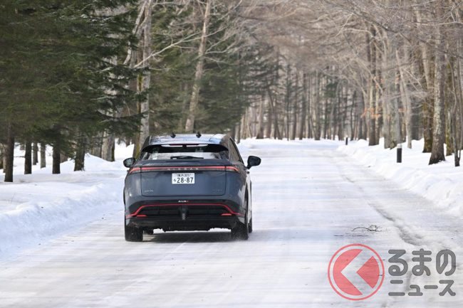 e-4ORCEは4つのタイヤの能力を最大限に引き出すことで、安定した加速やトラクション能力だけでなく、滑りやすい路面の旋回でも外側へ膨らみにくいライントレースの良さも自慢。実際に雪道で乗ってみましたが、その安定感には驚くばかりでした。