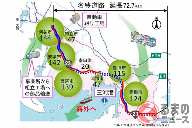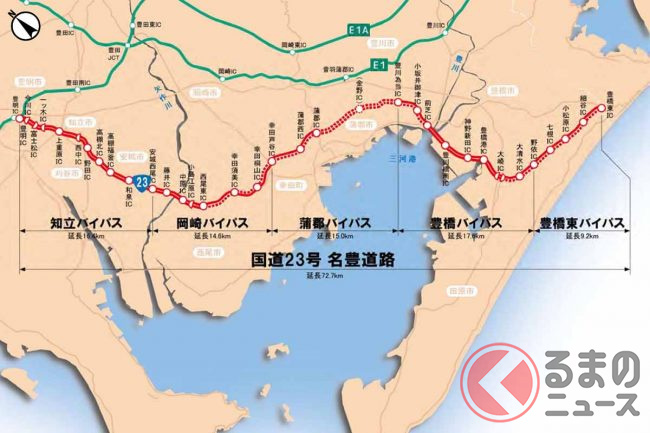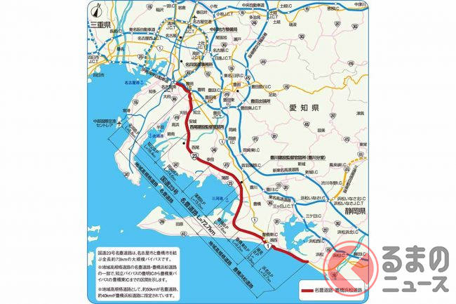 名豊道路は国道23号バイパスとして、愛知県豊明市を起点に、安城市や西尾市、蒲郡市、豊橋市をつないで、国道1号バイパスの浜松方面に直通します。