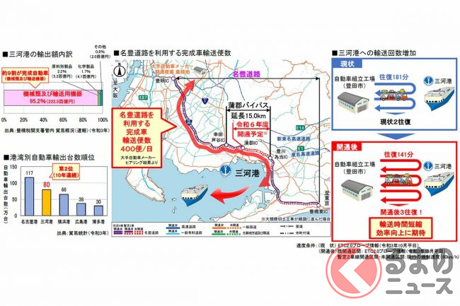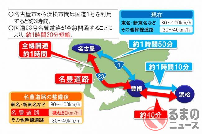 特に豊橋市にとっては、名古屋方面へのアクセスが悪く、東名まで延々と北上するか、国道23号の現道を延々と走る必要がありました。名豊道路が全通すれば、名古屋市内までの所要時間は約1時間に短縮されるとしています。