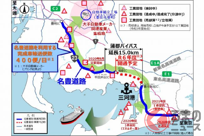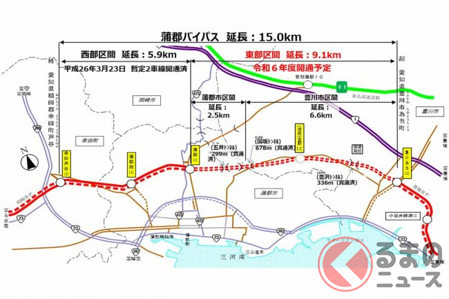 このブツ切れ区間が面倒で、名豊道路を下りて蒲郡市内の信号待ちと右左折が必要となっているため、早期開通への要望が高まっていました。