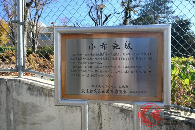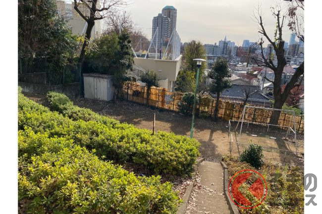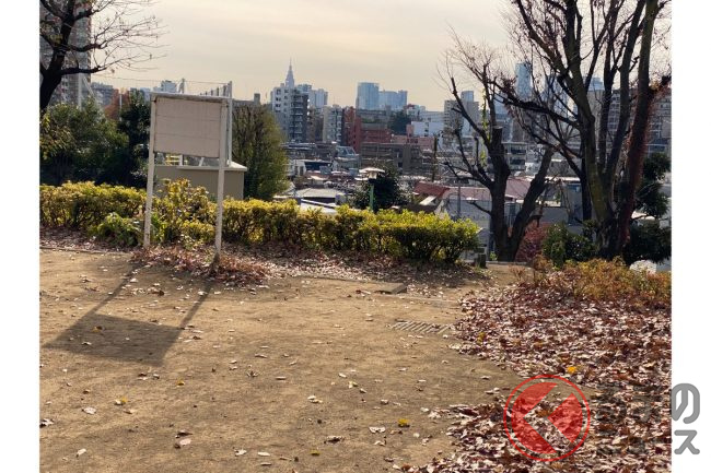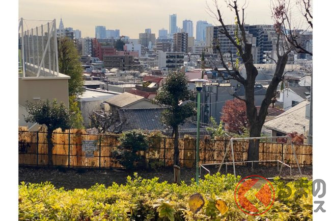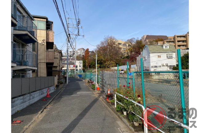 計画では、神田川の北に立地する日本女子大学附属豊明小学校の下にトンネルを通します。フェンス越しに北側を見ると、崖地がそびえ立ち、遥か上を目白通りが走っているのが分かります。もちろんこんな高低差はつなげられないので、崖をぶち抜いてトンネルで目白通りと立体交差していく計画になるのも、納得の場所でした。