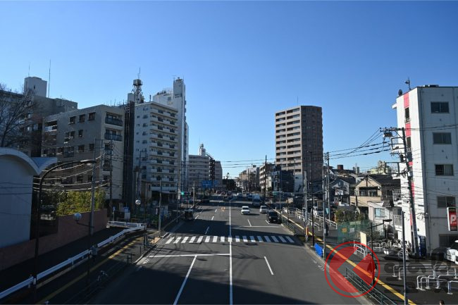 まず、西早稲田の現場を確認しました。都電荒川線(東京さくらトラム)が通る東西道路「新目白通り」へ、南から下り坂で4車線道路が接続します。これが開通済みの環4の一部です。今はT字路ですが、将来的にはこのまま北へ伸びていき、護国寺・田端方面の道路(ここでは不忍通りという名前になる)へつながっていく計画です。