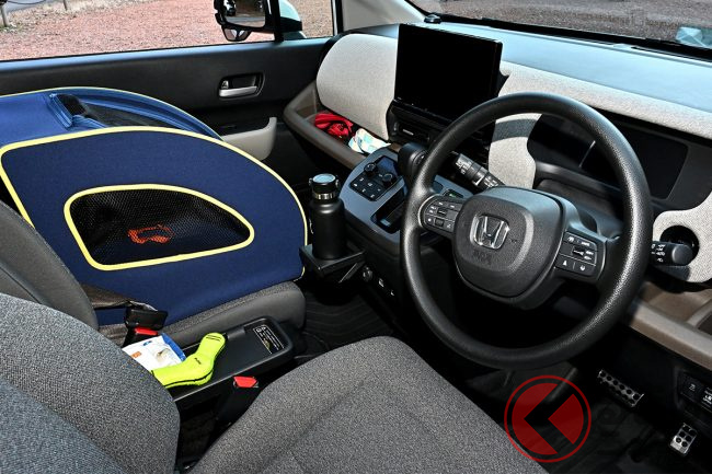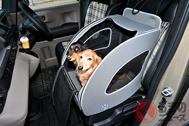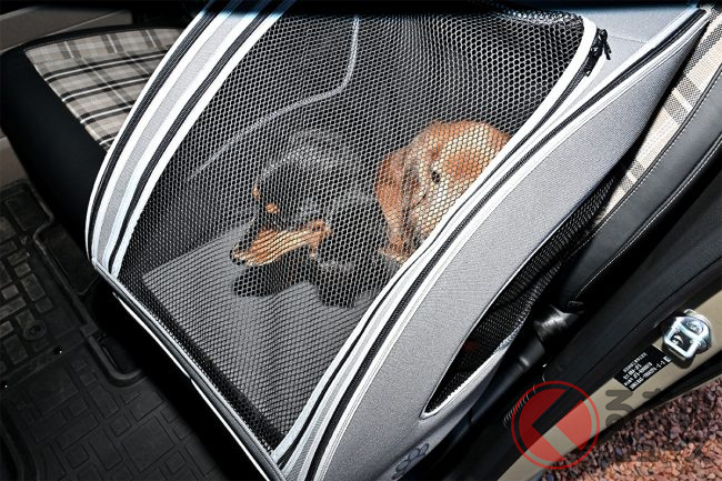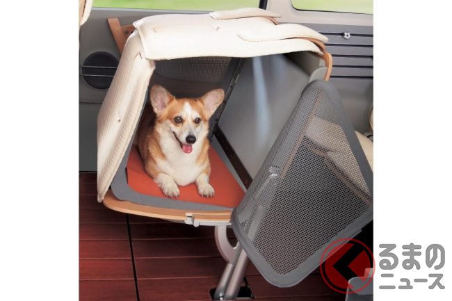 助手席前のフタを開けると、小型犬を乗せることができるクレートが出現。フロントとサイドをメッシュ加工にすることで通気性を確保するとともに、助手席の乗員と向かい合わせになるため、愛犬も快適に安心して移動することが可能です。