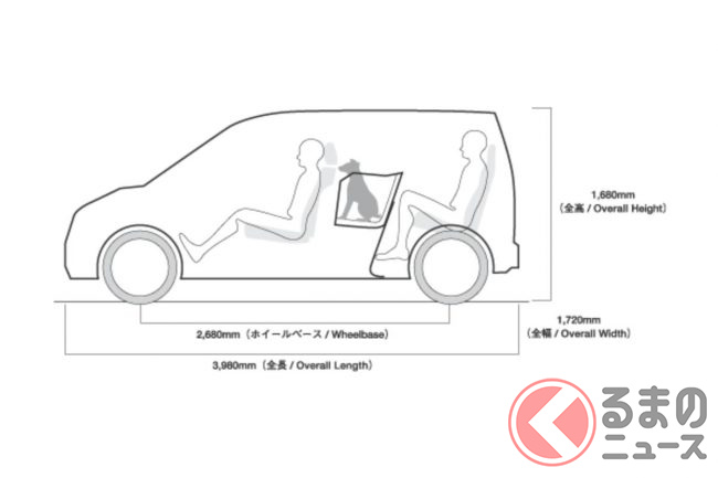 ボディサイズは、全長3960mm×全幅1720mm×全高1680mm、ホイールベースは2680mm。