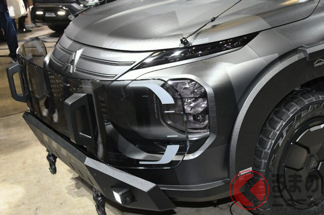 “ド迫力”な三菱「“新”SUV」に反響多数! 斬新フロントシールド&堅牢フェンダーがスゴイ! “メタルギアソリッド”コラボ「アウトランダーPHEV“ナイトシーカー”」に熱視線