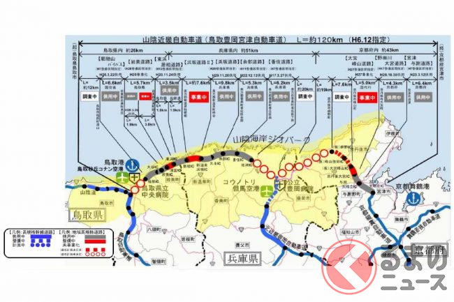 壮大な計画ですが、今やかなりの割合が開通済みとなりました。鳥取県と島根県ではほぼ全通で、未開通部はほんのわずかです。山口県では萩市・長門市の市街地の一部が開通しているだけで、事業化すらまだの工区も残っています。
