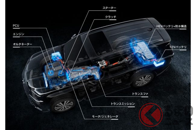 この新しいパラレルハイブリッドシステムとは、これまでのフルタイム4WDやトランスファー Loレンジ、トルクコンバーター付オートマチックトランスミッション(AT)といった駆動系を維持し、3.5リッター V6ツインターボエンジンと10速ATの間に、クラッチを有する「モータージェネレータ(MG)」を配置する方式です。