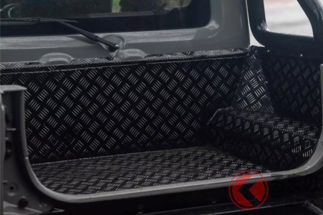 6輪にするために車体の延長に必要な車軸は、ジムニー純正のアクスルを追加。ホイールアーチもオリジナルで作成しています。延長されているリアセクションには丁寧に仕上げられたカスタムテールゲートが備わりました。
