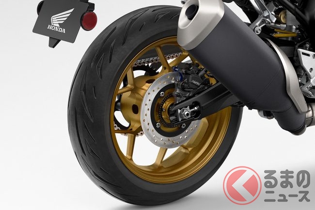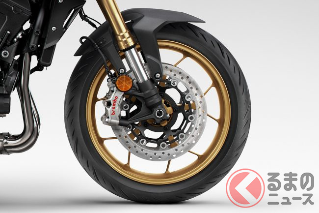 足回りでは、フロントにプリロード&ダンピング調整が可能な、ショーワ製41mm倒立フォーク、310mmフローティングディスクにブレンボ製4ポッドキャリパーを組み合わせます。リアもプリロード調整が可能な、オーリング製ショックアブソーバーを備え、上品な乗り心地に寄与します。ホイールはCBR1000RR-Rのファイアブレードコンセプトから継承された、5本のY字スポークデザインゴールドアルミホイールを採用し、17インチのワイドタイヤを合わせます。