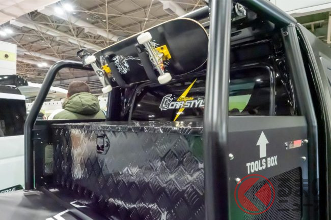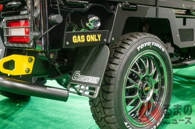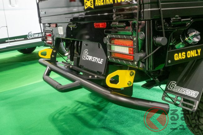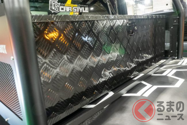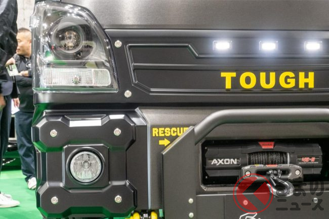 スタッフの方によれば「フロントバンパーやウィンチ、それにサイドパネルなども装備することで、弊社の技術力を見せつつ『こんな風に改造できるんだ!』というのを来場者の皆さんに感じ取って欲しかった」と話していました。