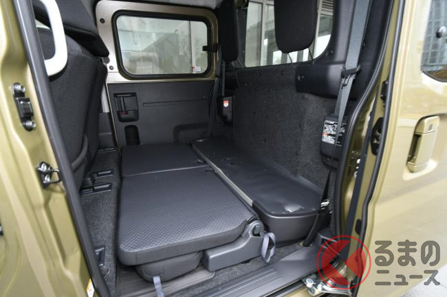 シートの作りも、乗用車目線で見るとハイゼットカーゴの場合前席と後席の格差が激しく、前席はゆとりのある座面で撥水加工の表皮を採用し、クッションの厚みもしっかりありますが、後席はかろうじて底付きをしない程度のクッションとなり、背もたれともなると板のよう。