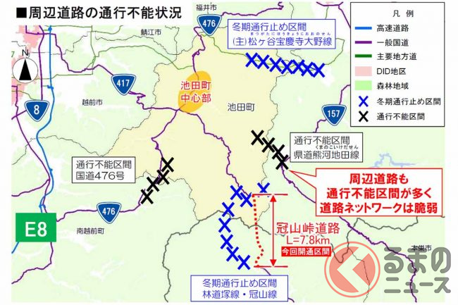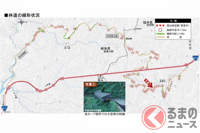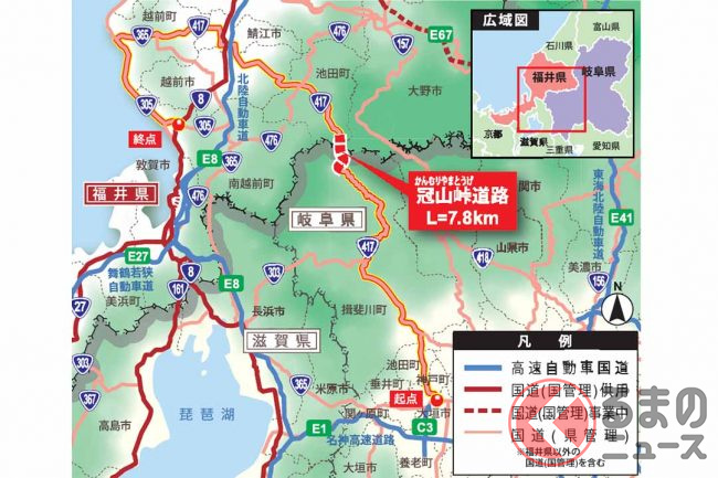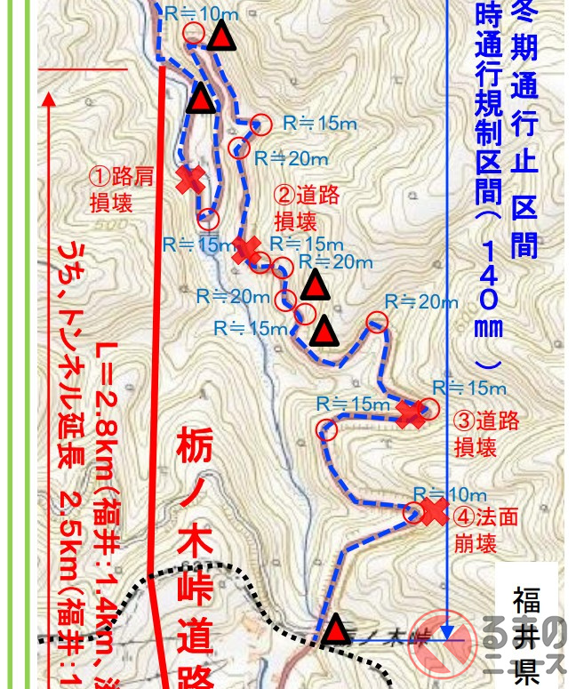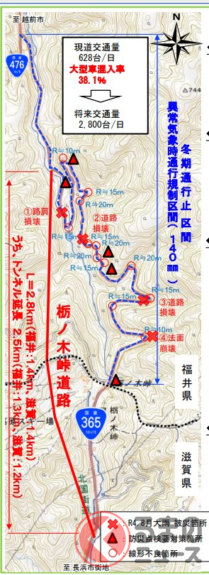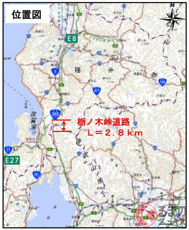 いわば滋賀県~福井市を短絡するルートですが、最大の難所である県境部「栃ノ木峠」がいまだに未改良となっていて、長期間の冬季通行止めがあるほか、ギリギリの狭隘崖っぷち区間やヘアピンカーブが連続し、大型車や慣れないドライバーにとっては通行困難で、長距離ネットワークとしては不十分でした。