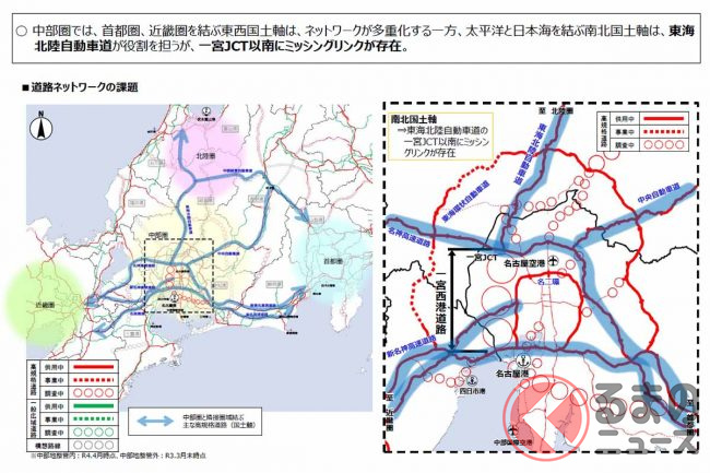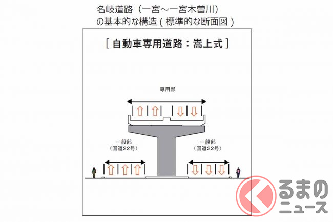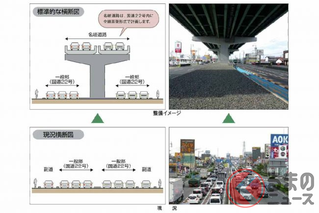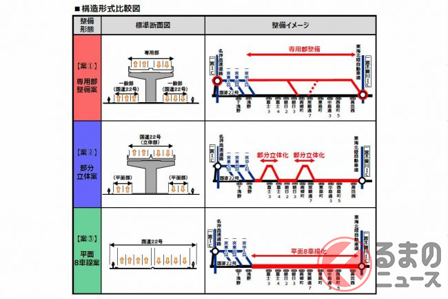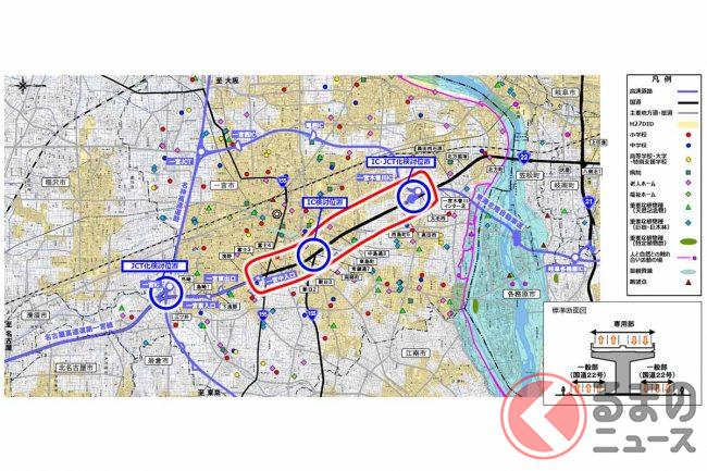ほかの案には、一宮JCTからまっすぐ南進して最短距離で伊勢湾岸道までつなぎ、「西尾張中央道」の上空に高架を建設して用地取得を最低限に済ませる案がありました。