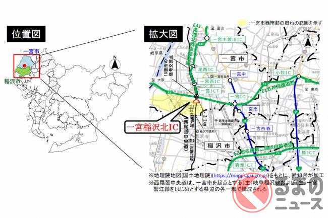 具体的には、一宮JCTからやや西寄りに進路を変え、西尾張中央道と国道155号のちょうど中間あたりを南下していきます。