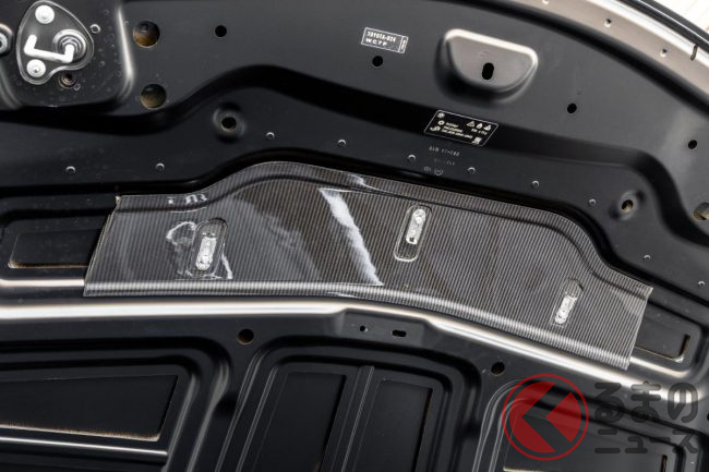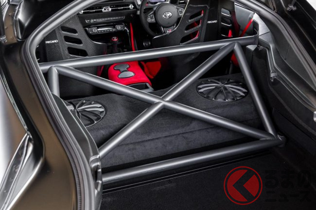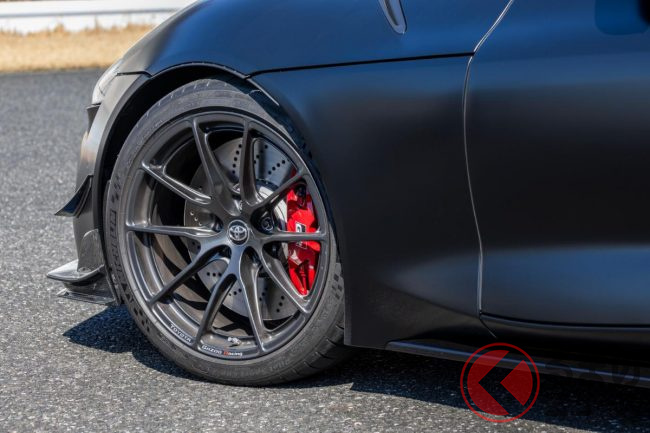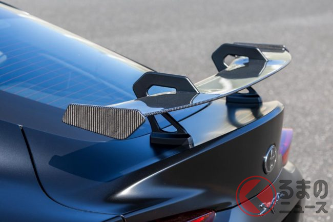 エクステリアでは、カーボンフロントスポイラー、カーボンフロントカナード、フロントセンターフラップを採用。さらに、GR Supra GT4を彷彿させるスワンネック構造のカーボンリヤウイングを装備することで前後の空力バランス、ダウンフォース、ドラッグを最適化し、接地性とハンドリング性能を向上させています。