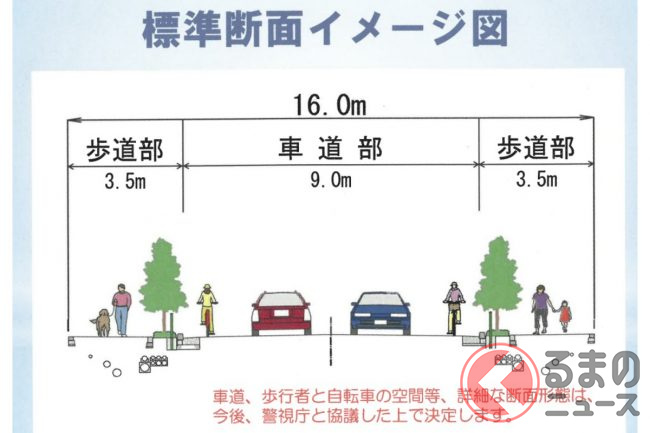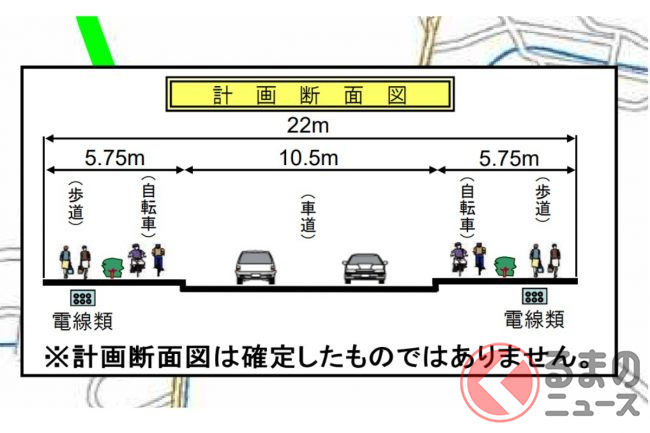 計画幅員16mの2車線道路で、当初事業期間は2036年まで。まずは測量設計が進められ、そのあと用地取得が始まっていきます。