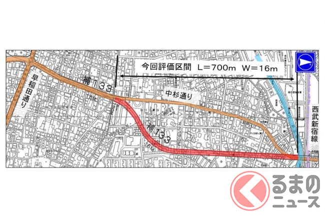 中杉通りは、青梅街道~目白通りが「一応つながっている」状況で、新青梅街道の前後の計2工区ですでにバイパス・拡幅事業が進行しています。
