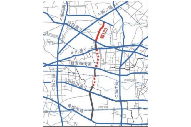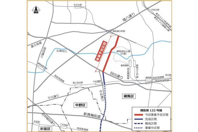 補助第133号線の全体計画は、馬事公苑前の世田谷通りからざっくりと経堂駅・桜上水駅・西永福駅・南阿佐ヶ谷駅・阿佐ヶ谷駅・鷺ノ宮駅・中村橋駅・練馬春日町駅を経由し、環八通りをまたいでさらに下赤塚駅に至るという、まさに世田谷区~練馬区の壮大な南北道路となっています。