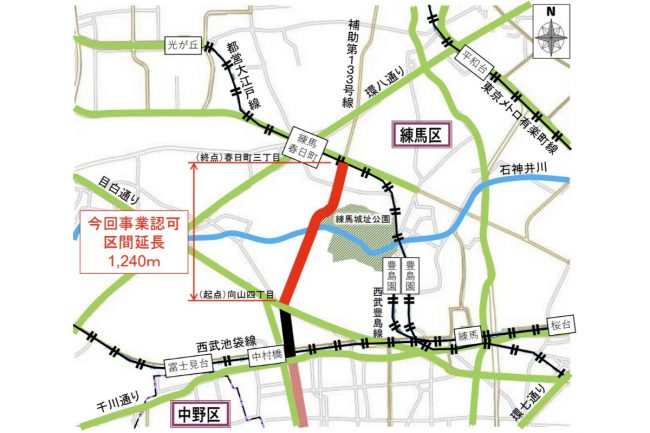 「向山工区」と名付けられた今回の事業化区間は、豊島園・豊島城址公園の西側をかすめて北上。練馬春日町の地下鉄大江戸線の道路へ接続します。すぐ西側に環八通りの「春日町交番前」交差点があります。