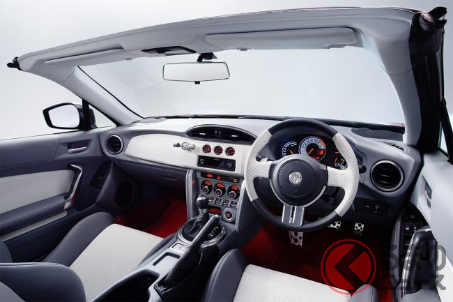 ベースとなった86の流麗なスタイルを損なうことなくコンバーチブル化を実現し、ホワイトを基調とした内装にはネイビーブルーとイエローゴールドのアクセントが施され、スポーティかつ華やかな印象を与えます。