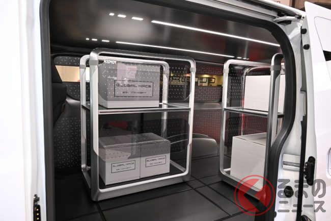 300系ハイエースベースにBEV化したモデルの新型グローバル ハイエースは、用途によりバッテリーを2層もしくは1層から選択可能です。積載性よりも航続距離を重視したい場合は2層、航続距離が多少短くても積載性を重視したい場合は1層、そんな選択肢が用意されています。