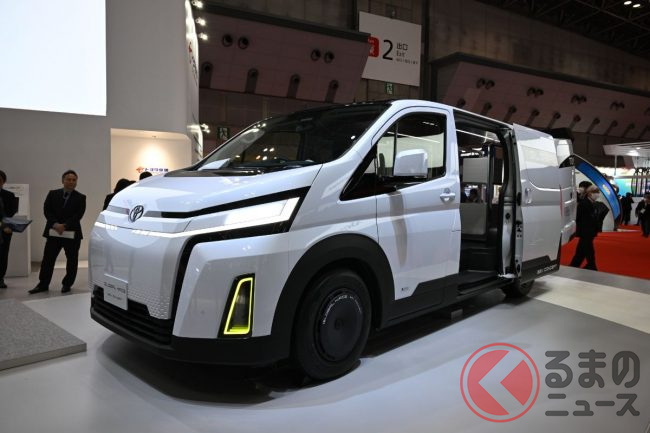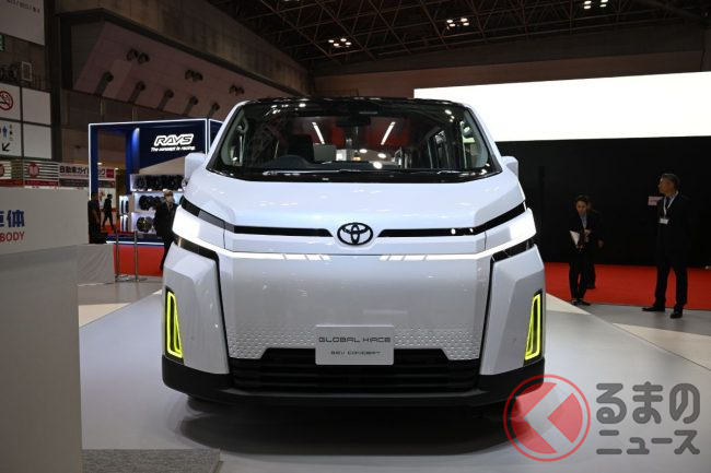 トヨタ車体がJMS2023で発表した300系がベースのグローバル ハイエースについて、トヨタ車体は「先進的なデザインと大空間、使いやすさを兼ね備えた次世代BEV(バッテリーEV)バン」と定義しています。