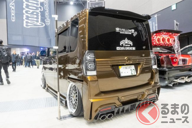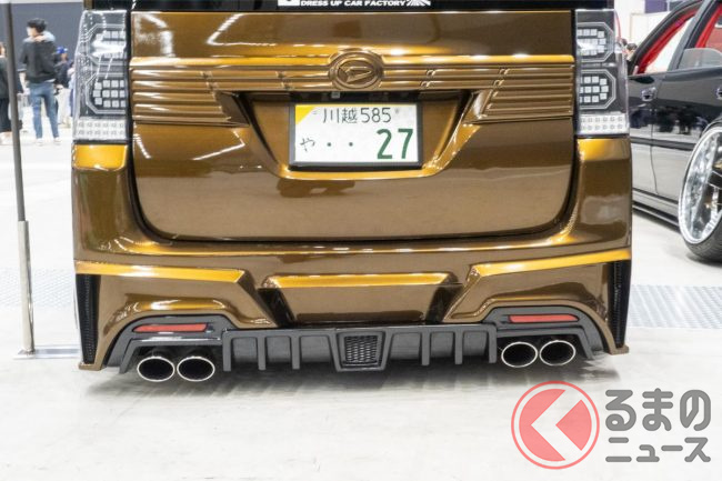 ダイハツノレクサス!? ド迫力“スピンドル顔”の「軽ワゴン」登場! 4本出しマフラーも超カッコイイ「タント」のカスタムモデルがスゴイ