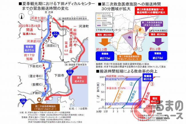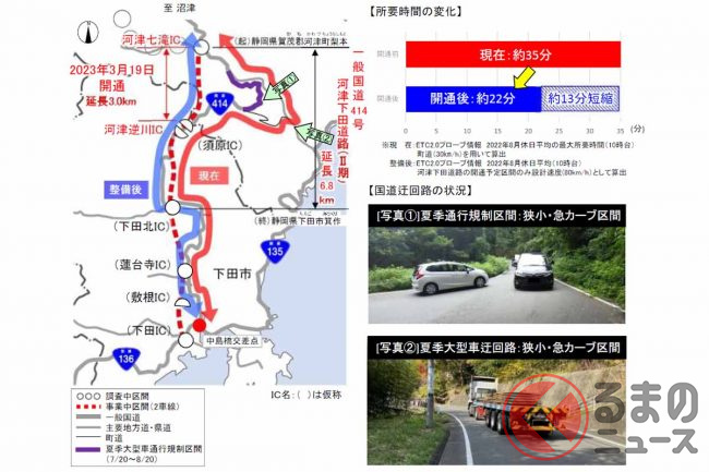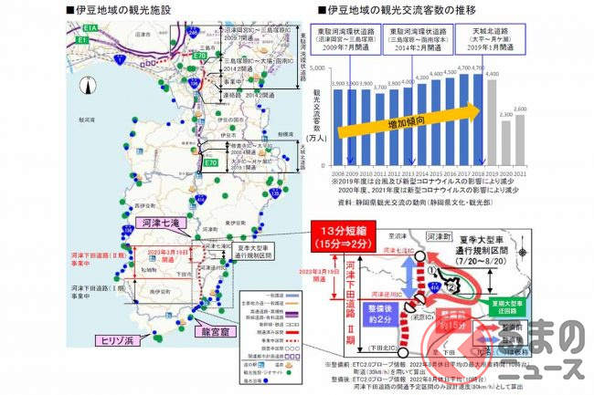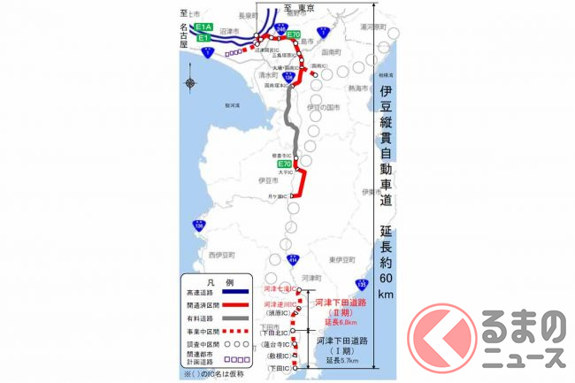特に下田にとっては、関東圏からの定番観光地でありながら、果てしない道のりであり、途中に渋滞ポイントも多いため、全通にかける思いは強くなっています。沼津~下田の所要時間はわずか60分に短縮される試算になっています。