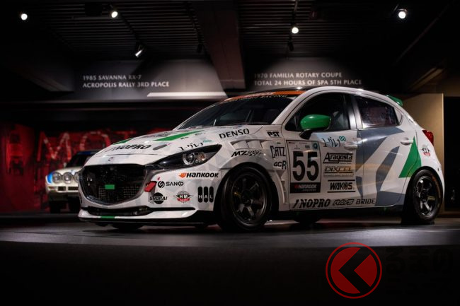 マツダが白い「最新スポーツカー」実車公開! 伝統の“ロータリーエンジン”搭載&「パカパカライト」採用! 2ドアクーペ「アイコニックSP」も展示のマツダミュージアム 4月1日に一般公開!