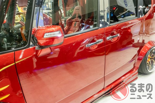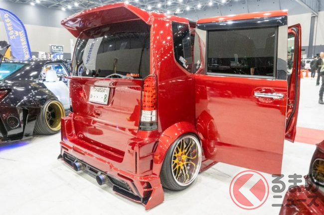 “BMW”顔の「軽」!? まさかの“観音開き”仕様な「N-BOX」公開! 鮮烈レッド内装も超カッコイイ「ドイツ風スーパーハイトワゴン」とは