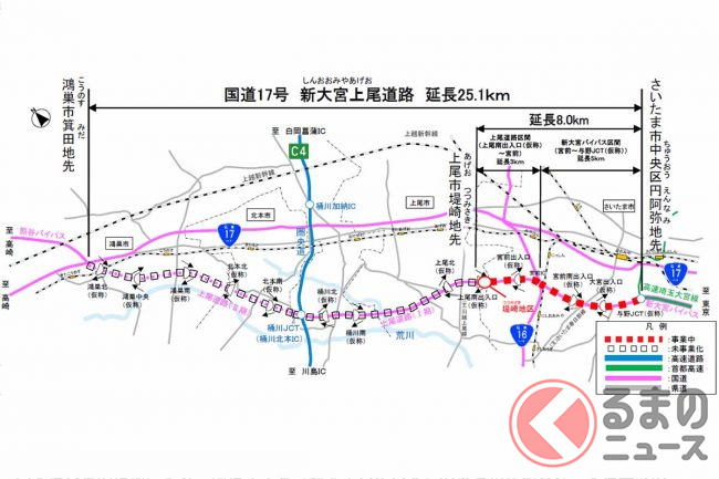 首都高埼玉大宮線をさらに北へ延伸し、上尾方面までつなげる工事が進行中です。一体どのような道路で、どこまで工事が進んでいるのでしょうか。