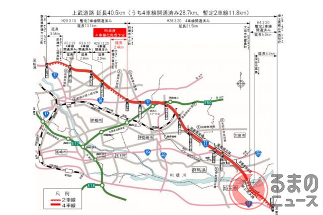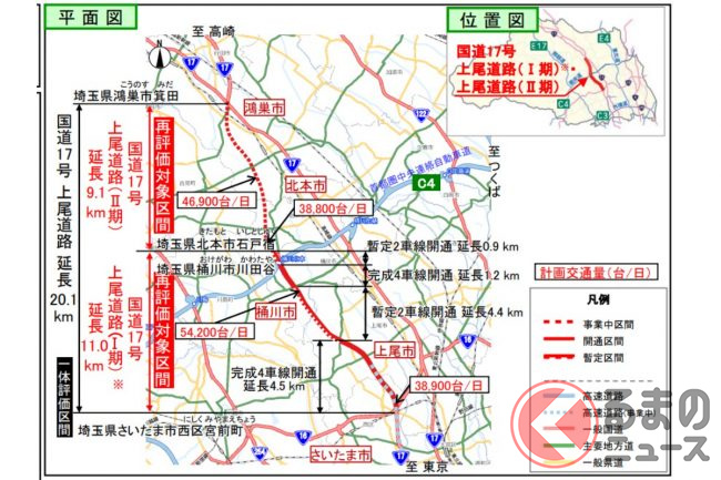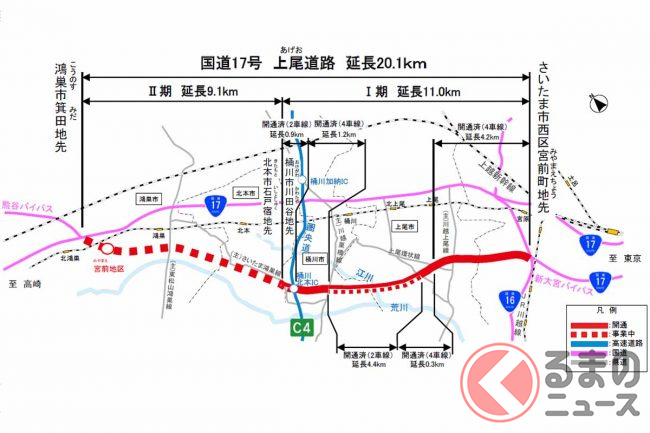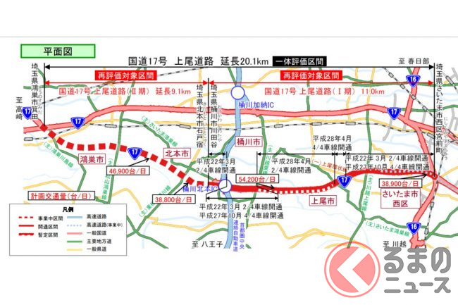 地上の一般道路は新大宮バイパスから直通する「上尾道路」が桶川市の圏央道まで開通済みで、4車線化も同時進行中。圏央道から北側でも準備が進められ、将来は熊谷バイパス・上武道路へ直結し、前橋市街や、渋川の関越道までつながる計画となっています。