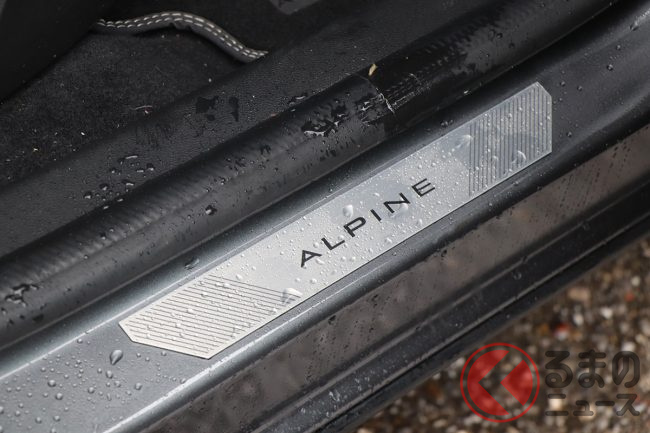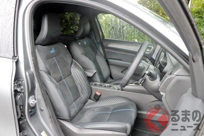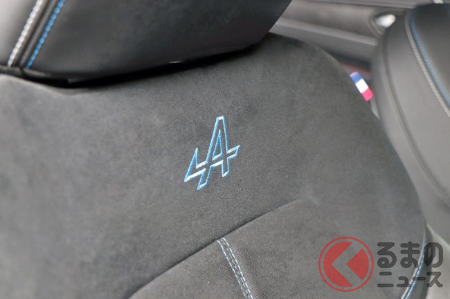 フロントシートバックにはアルピーヌの「A」エンブレムの刺繍が施されているほか、内装各部にフランス国旗を連想させる赤・白・青のステッチが走っているのもポイントです。