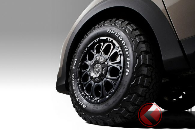 エクステリアは、ノーマルの都会的なイメージにSUVらしいタフネスさを融合。アンダーガード風デザインの専用バンパー、ブラックアウトされたフロントグリル、無塗装樹脂製のフェンダーアーチモールなどを装着し、力強い印象を与えます。サイドのモールも落ち着いたブロンズ調の専用品に変更されるなど、細部まで作り込まれていました。