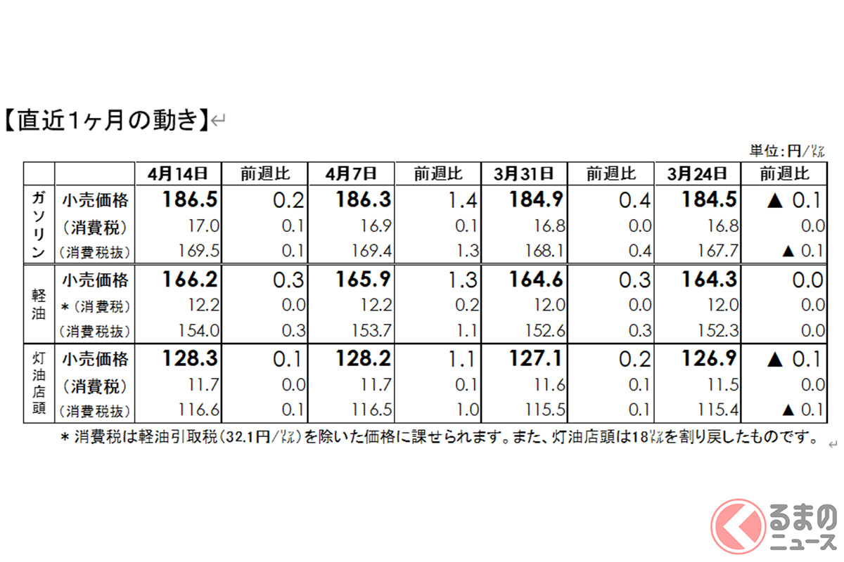 2025年4月16日に資源エネルギー庁は、ガソリン等の「店頭現金小売価格調査の結果」に関して、同月14日時点の店頭価格(消費税込)を発表しました。