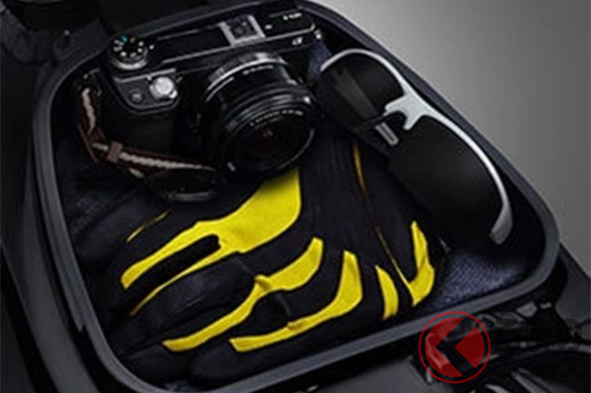シート下にはUSBソケットが備わった7リットルの収納スペースを備え、フロントのフックは買い物袋などを引っ掛けるのに便利です。