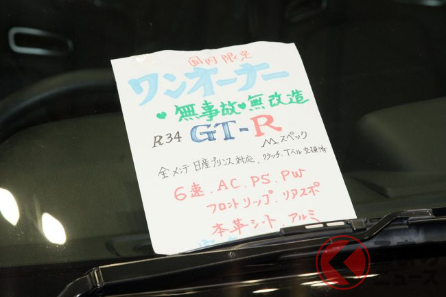 案内サインには「国内オーナー求む!」と記されているとおり、ヴィンテージ宮田自動車は「海外流出が進むR34型GT-Rを、国内に一台でも多く残したい」と話していました。