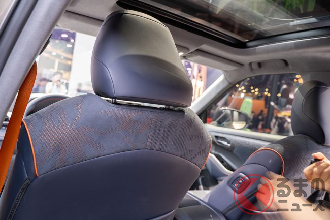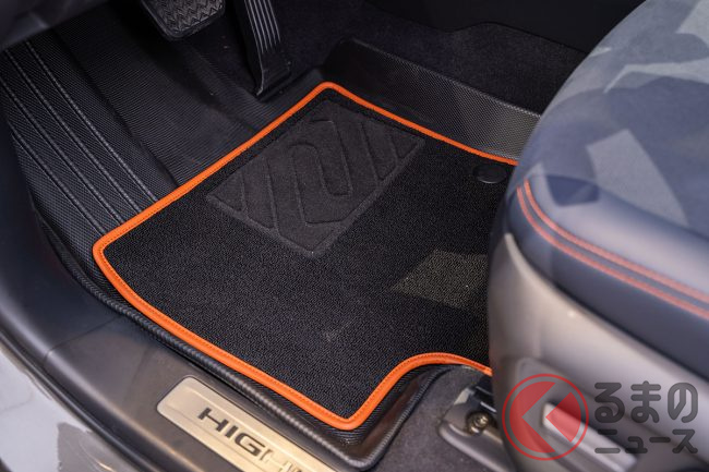 内装は紺色を基調としつつ、ステアリングやアームレストといった部分にオレンジ色のステッチ加飾を施しています。シートは表面を紺色にしつつ、模様を描くパンチホール加工越しに中からオレンジ色の材質が姿を覗かせます。フロアマットにもオレンジ色の装飾があるだけでなく、シートベルトまでもがオレンジ色となっているあたりは他ブランドの車種や特別仕様車でもなかなか見ない色の組み合わせです。