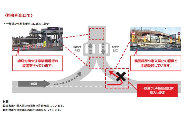 高速道路各社では車両の逆走を防ぐため、道路に進行方向を示す矢印を表示する、合流部分にラバーポールを設置するといった対策を取っています。